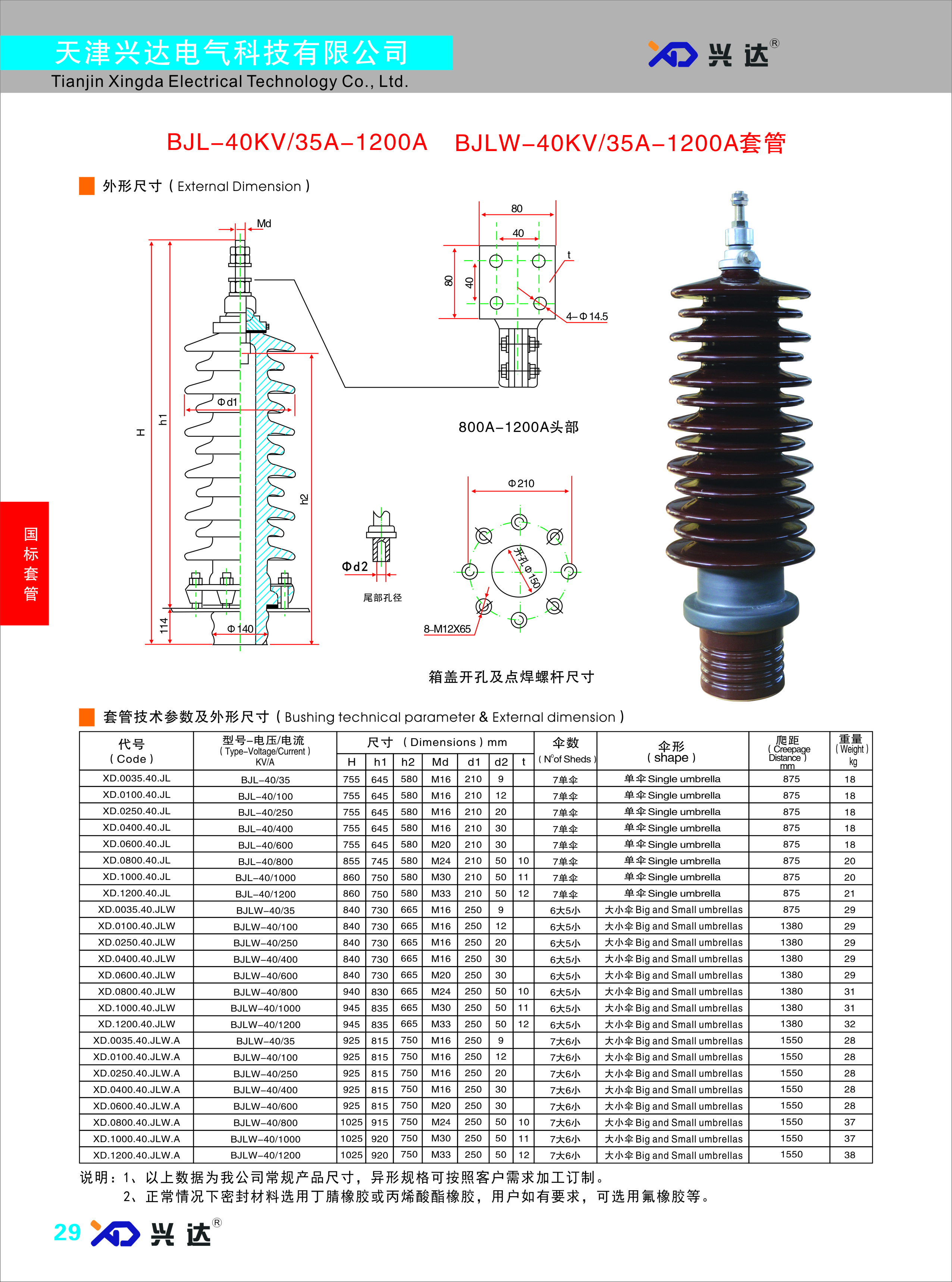 天津興達(dá)電氣科技有限公司成立于2006年,位于天津市津南區(qū)八里臺工業(yè)園區(qū),地理位置優(yōu)越,交通便利,是一家專業(yè)從事變壓器的高新技術(shù)企業(yè)。主要生產(chǎn)變壓器護(hù)套、油位計(jì)、接線端子、活門、蝶閥、40.5kv及以下普通套管、法蘭式套管、德標(biāo)DIN套管、美標(biāo)ANSI套管、以及按照IEC、EN、AP、HD標(biāo)準(zhǔn)生產(chǎn)的變壓器套管,并可研發(fā)、設(shè)計(jì)制造各種非標(biāo)變壓器套管。現(xiàn)已成為保定天威、北京合縱、新疆特變電工、等150家企業(yè)的合格供應(yīng)商。
