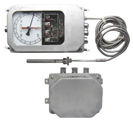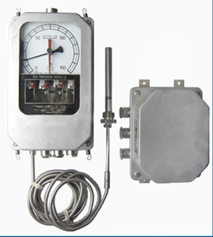 油浸式變壓器溫度控制器是用于測量電力變壓器內(nèi)變壓器油溫的測量儀表,儀表采用復(fù)合傳感器技術(shù),即儀表溫包推動彈性元件的同時,能同步輸出Pt100熱電阻信號,此信號可遠傳到數(shù)百米以外的控制室,通過XMT系列數(shù)顯溫控儀同步顯示并控制變壓器油溫。也可通過XMT系列數(shù)顯儀表,將Pt100熱電阻信號轉(zhuǎn)換成與計算機聯(lián)網(wǎng)的直流標(biāo)準(zhǔn)信號(0~5V、1~5V、4~20mA)輸出。儀表采用外置接線盒方便用戶接線。